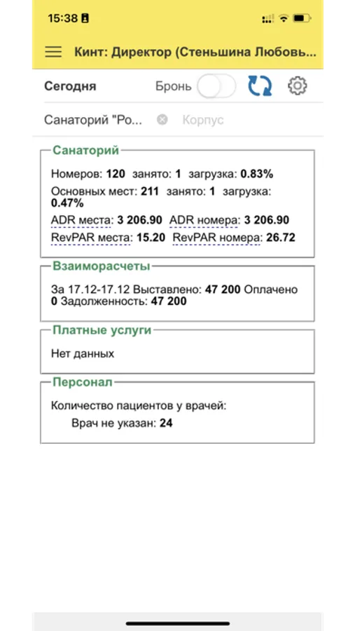 Отражает показатели загруженности санатория и персонала, данные по реализации и поступлениям от путевок и услуг.