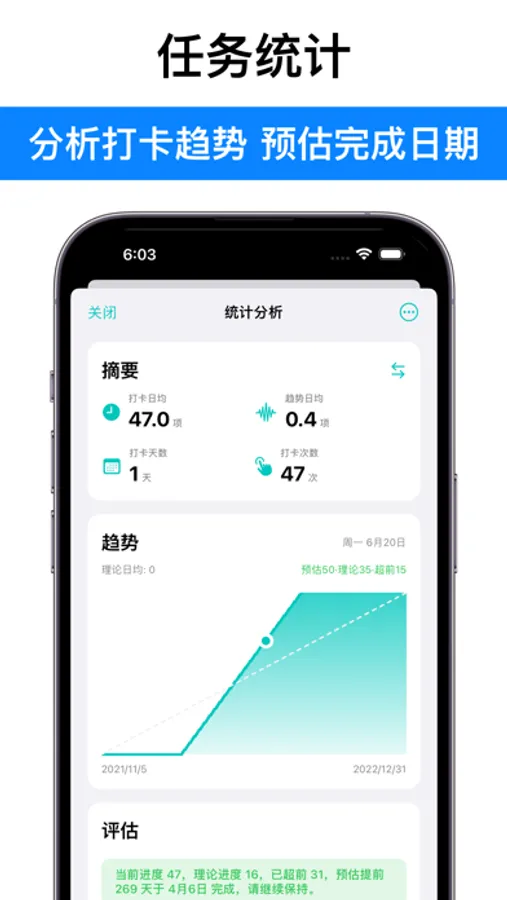 3. 支持图表统计分析学习进度情况、预测未来进度趋势与完成日期