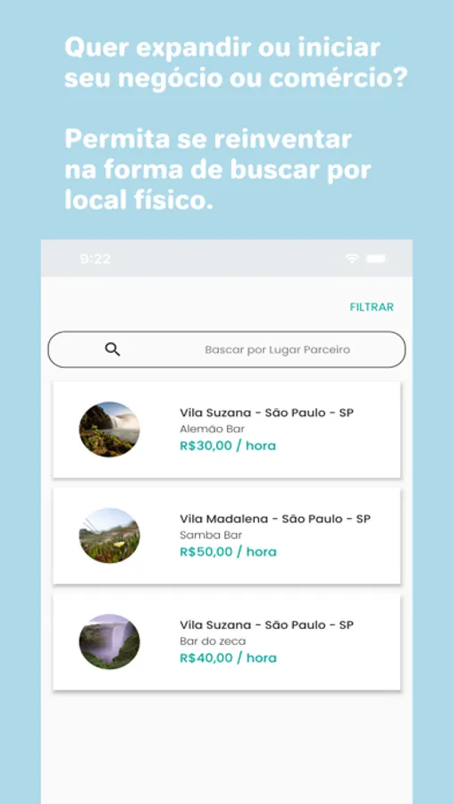 Reserve e compartilhe espaços físico de Comércio e itinerante. Encontre uma variedade de opções de espaços e melhore sua estrutura de trabalho, expanda seu negócio e aumente sua receita compartilhando e reservando espaços físicos.