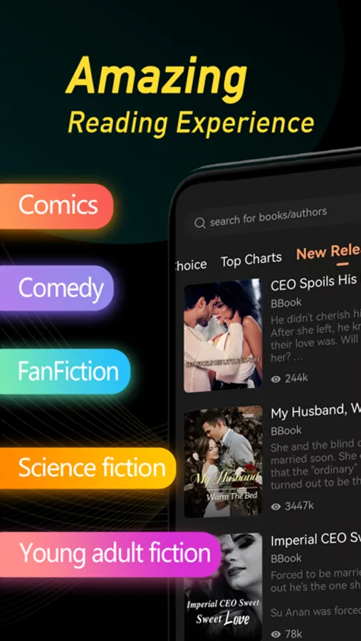 - Book Genres: Romance, Mystery, Fantasy, Western, Sci-fi, Fan-fic