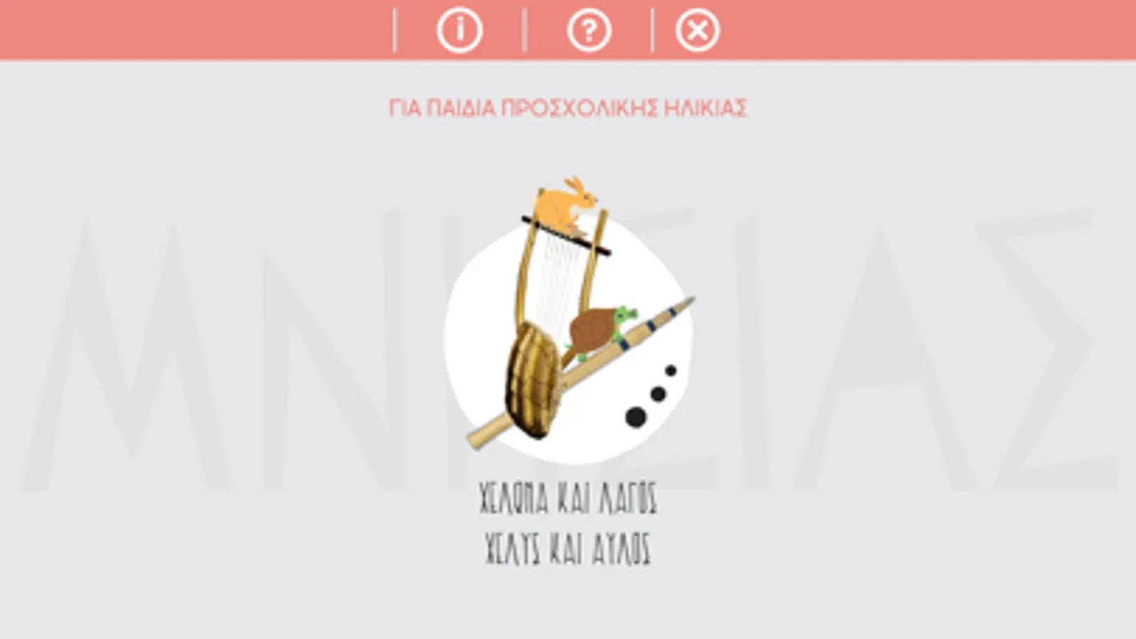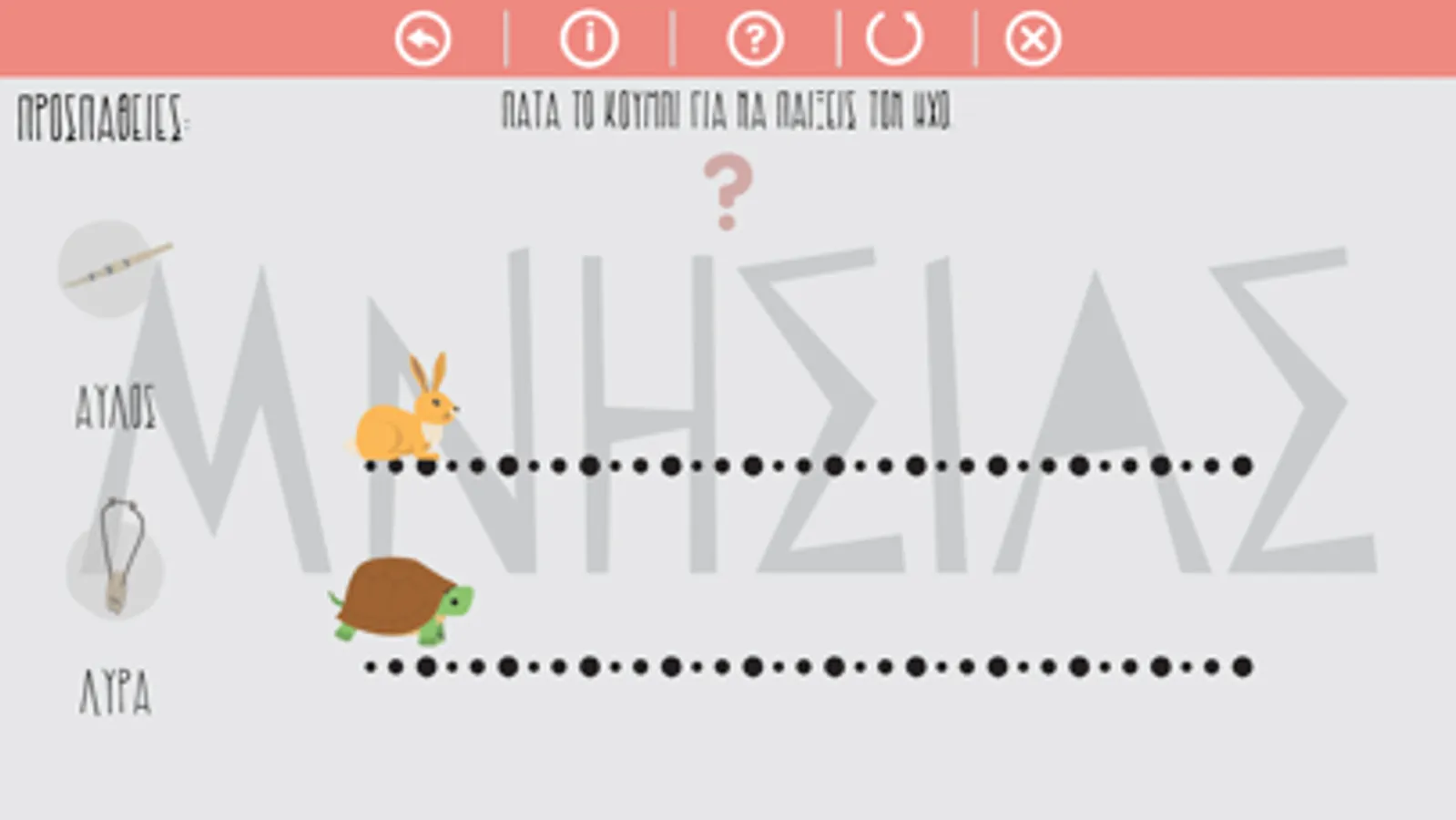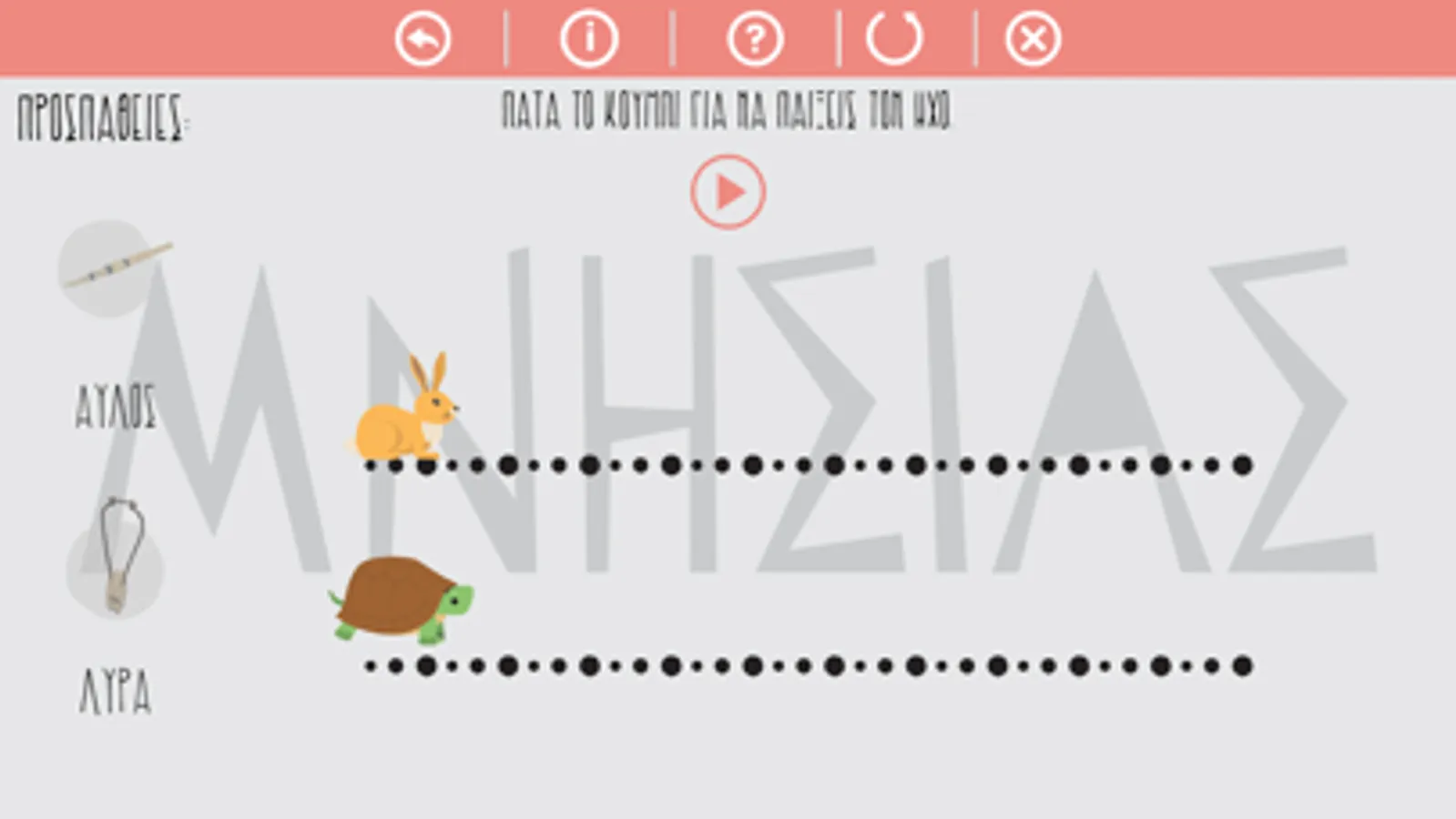 Να μάθει ο χρήστης να αναγνωρίζει τα ηχοχρώματα της λύρας και του αυλού. Είναι βασισμένο στο γνωστό παραμύθι του Αισώπου, λαγός και χελώνα ώστε να βοηθάει τα παιδιά της προσχολικής ηλικίας να αναγνωρίζουν πιο εύκολα τους ήχους.