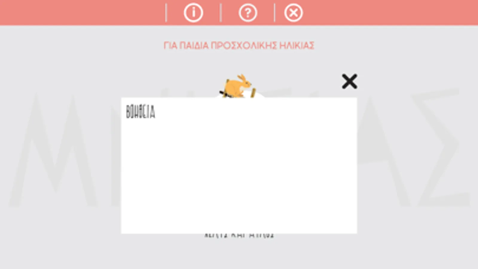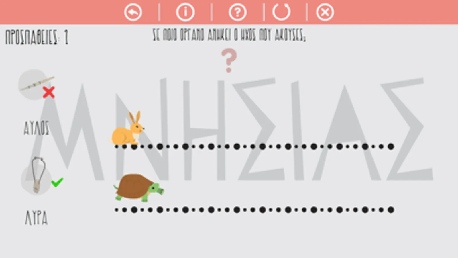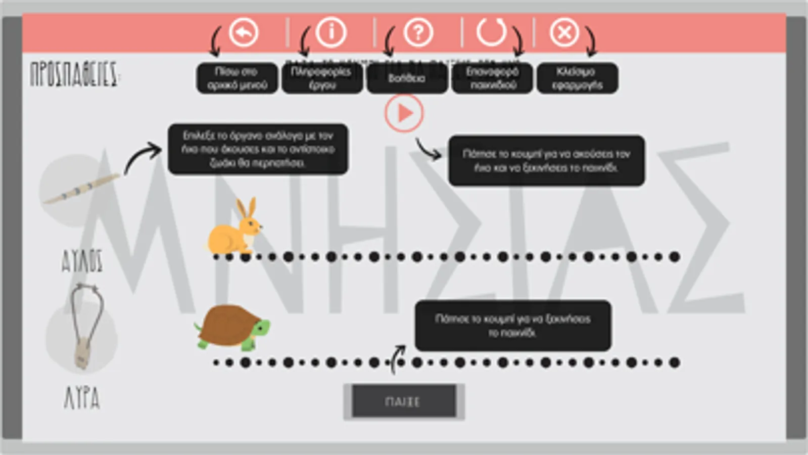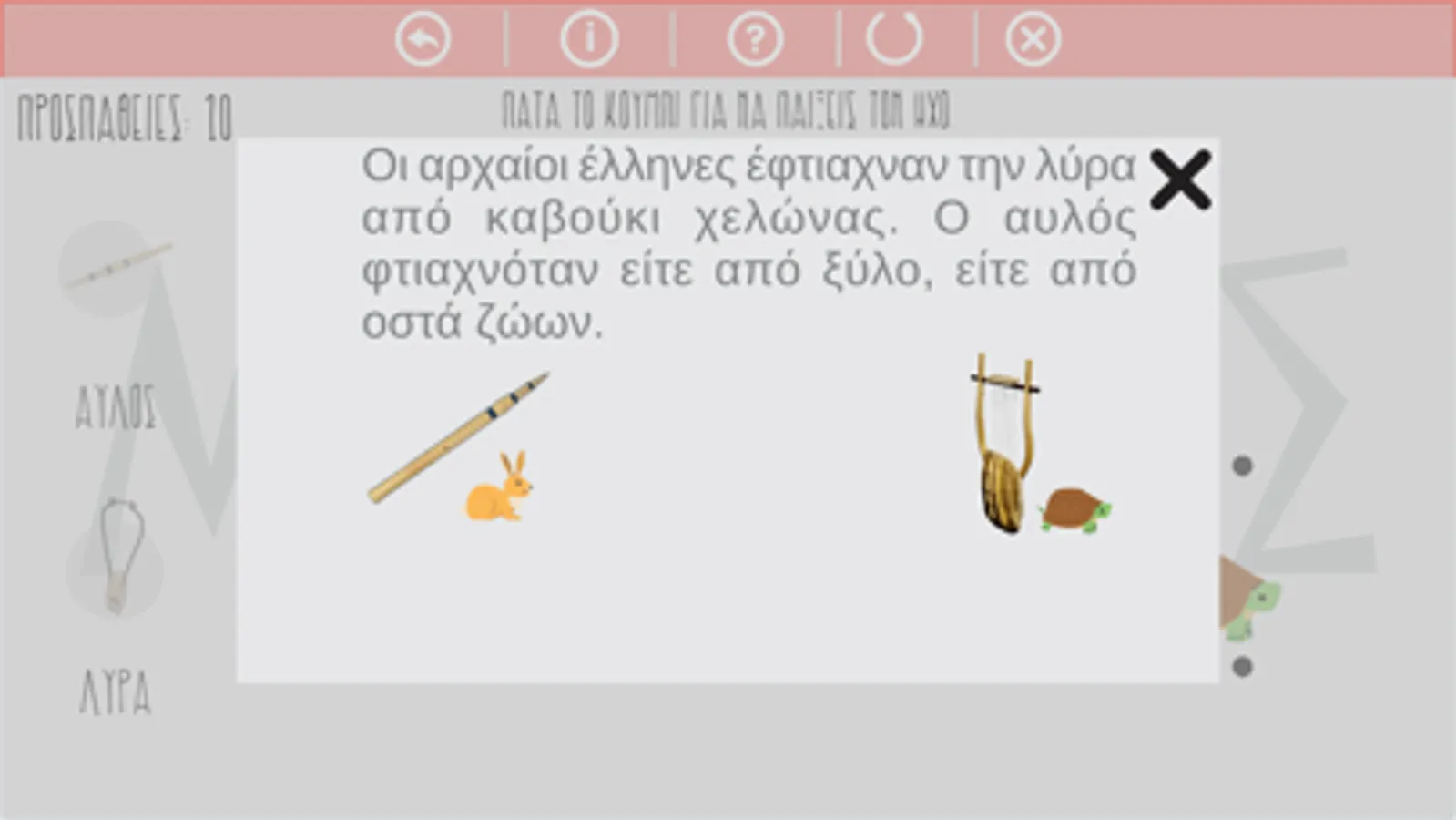 Να μάθει ο χρήστης να αναγνωρίζει τα ηχοχρώματα της λύρας και του αυλού. Είναι βασισμένο στο γνωστό παραμύθι του Αισώπου, λαγός και χελώνα ώστε να βοηθάει τα παιδιά της προσχολικής ηλικίας να αναγνωρίζουν πιο εύκολα τους ήχους.