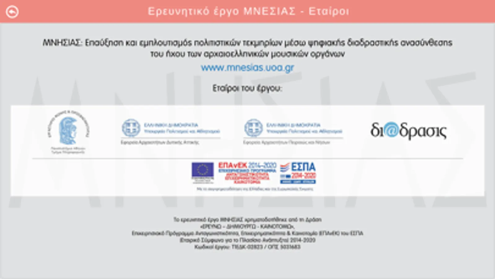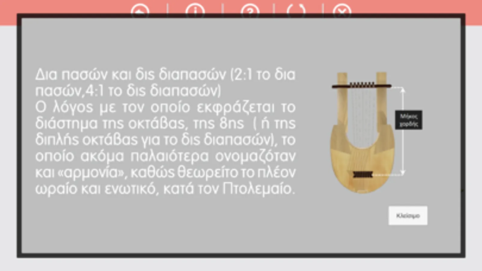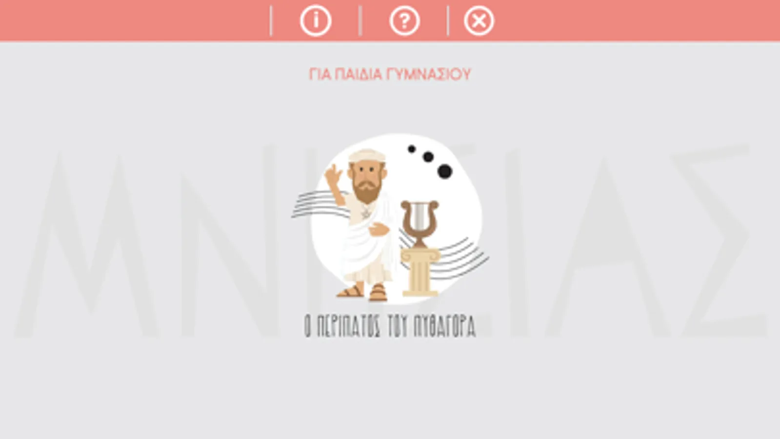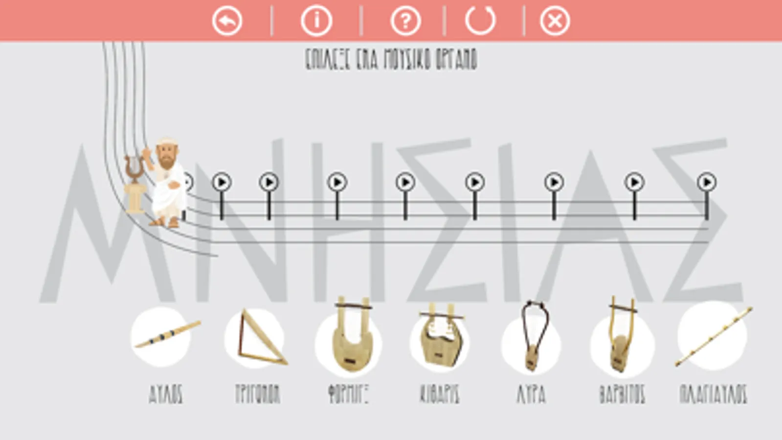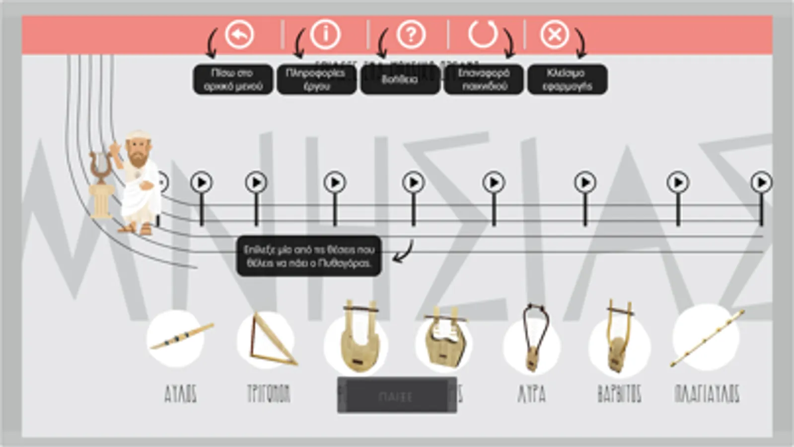 Να μάθει ο χρήστης τόσο τα ηχοχρώματα των αρχαίων μουσικών οργάνων αλλά και τις συχνοτικές αναλογίες των νοτών. Με την βοήθεια του Πυθαγόρα μπορεί να "επισκεφθεί" την κάθε μια νότα και να μάθει περισσότερα πράγματα για αυτην.