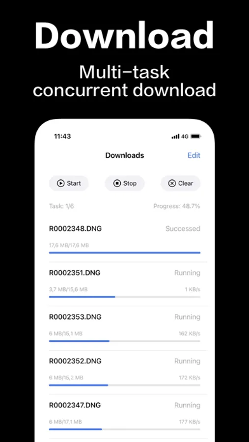 It supports quick camera connection, swipe to select multiple photos, and multitasking concurrent downloads.