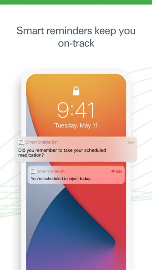 The Smart Sharps Bin Companion App works with your Smart Sharps Bin and monthly subscription to help you take injections on time, track your injection history, and enable hassle-free sharps disposal.