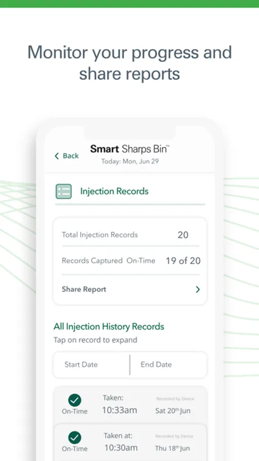 SEE YOUR PROGRESS: Access injection history reports to download and share