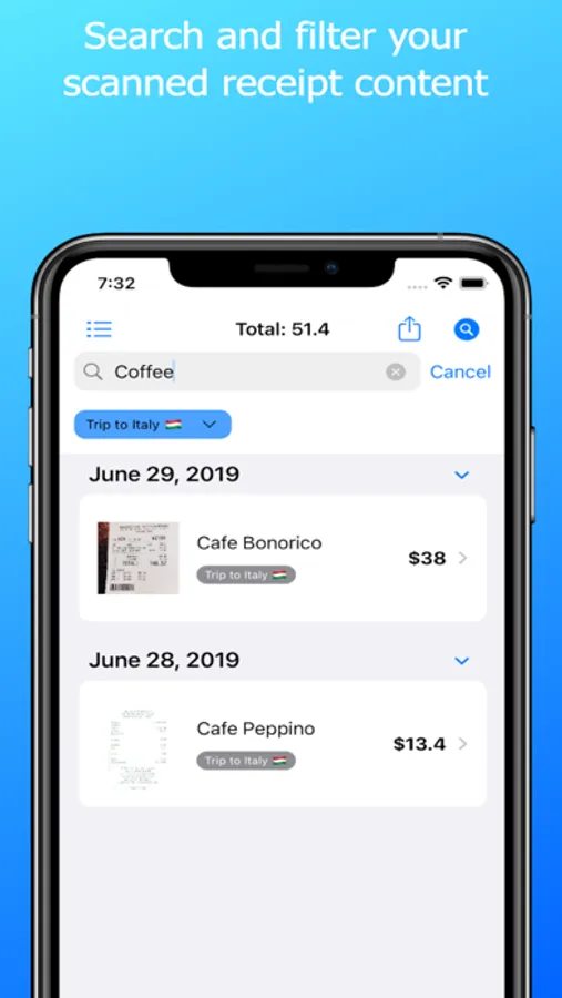 You can search through all your receipts content, and the OCR mechanism will identify if the search terms are present in your receipts. Trying to track down the receipt for a TV purchase? Looking for receipts containing the word milk? It's now possible.