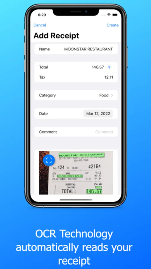 The OCR technology will automatically recognize important fields from your receipts like the title name, date, total balance, and currency.