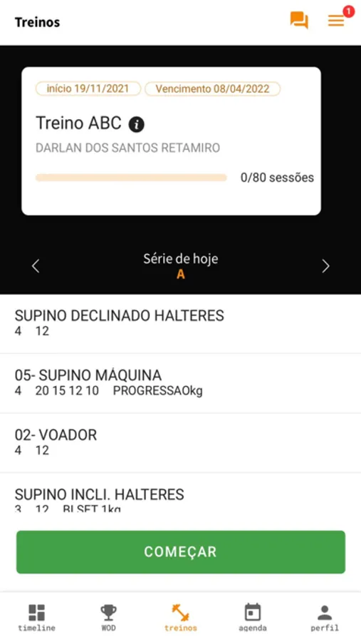 - Acesse seus TREINOS: informações sobre os exercícios, cargas, repetições, dicas de execução e vencimento do treino. Consulte também sua avaliação física sempre que quiser.