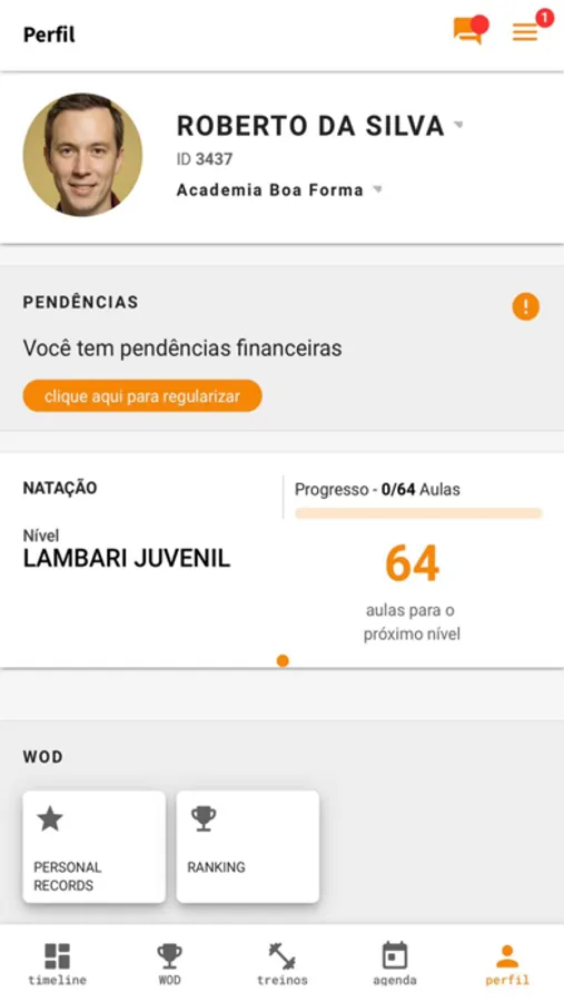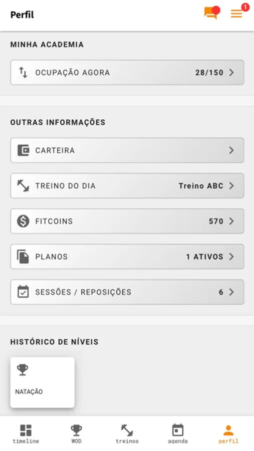 - Consulte seus FitCoins, a quantidade de alunos(as) treinando no momento, seus créditos e o WOD do dia.