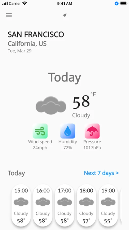 * Map overlay with temperature, precipitation, sea level pressure, wind speed, and cloud information
