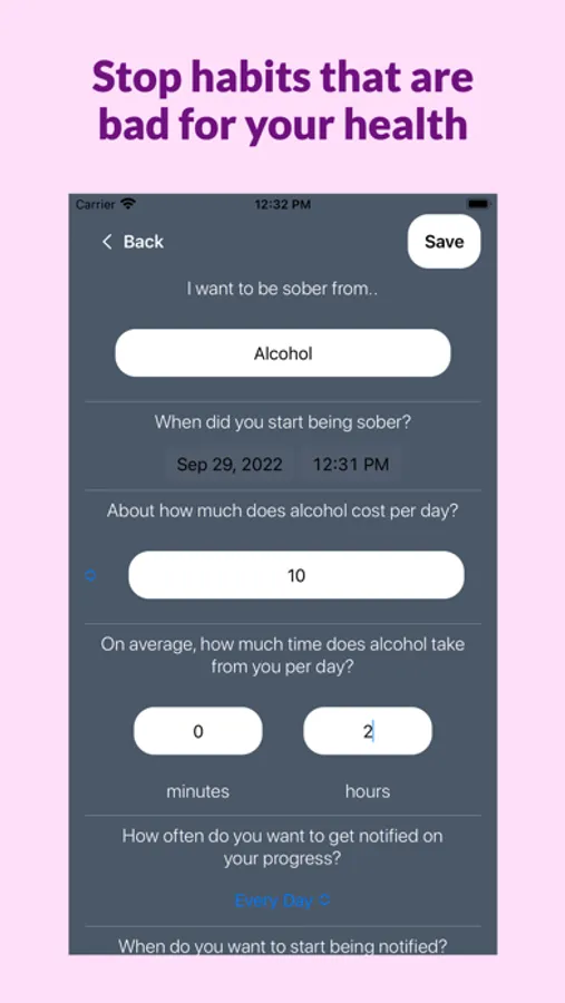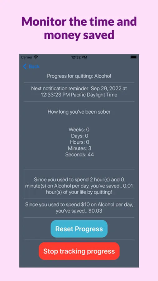 - Receive notifications that keep you posted on how much time and money you save by being sober