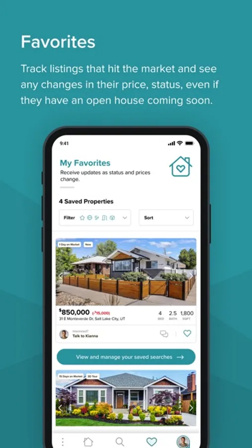 My Favorites: View saved searches and suggested homes with ease and connect with your agent for any questions.