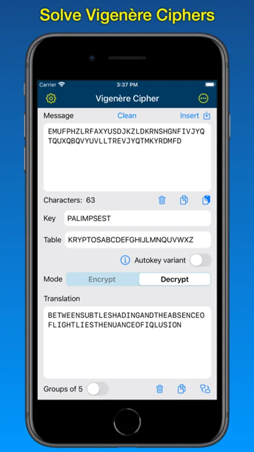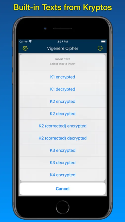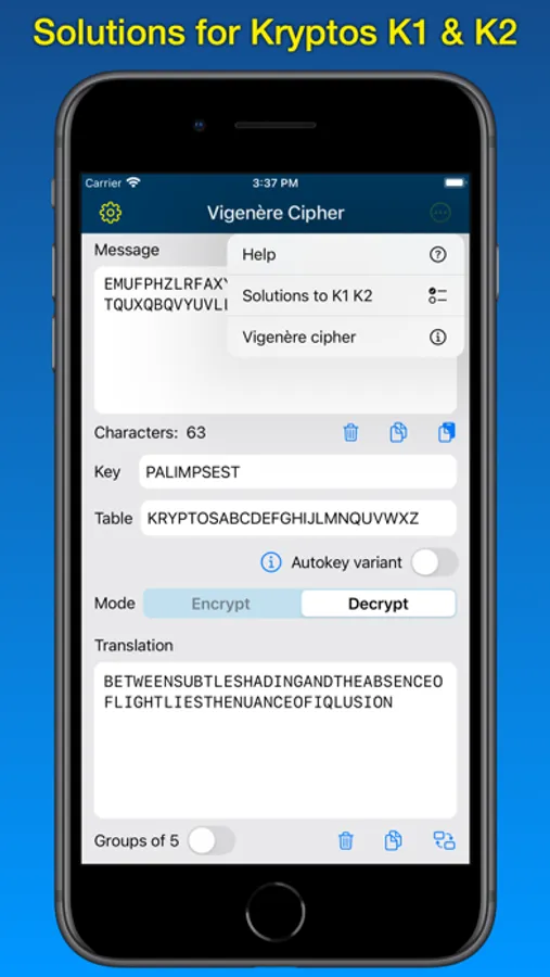 Kryptos Tools - Vigenère Cipher provides an easy interface to learn and use the Vigenère cipher. The Vigenère cipher was used to encrypt the first two sections of the Kryptos sculpture and solutions to these sections are detailed within the app.