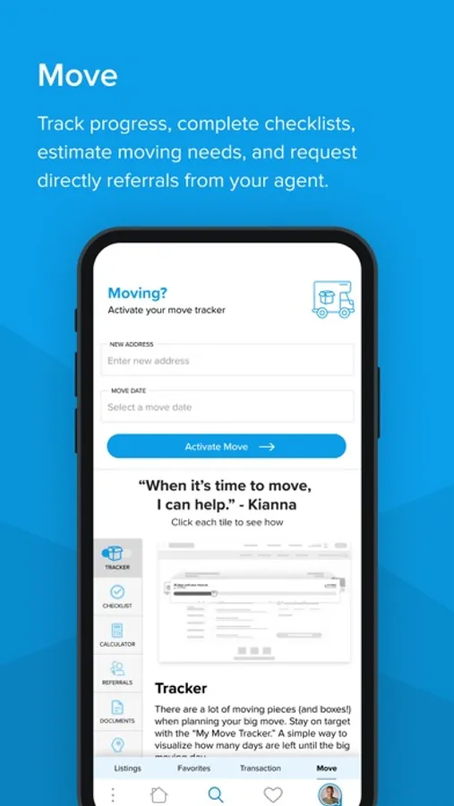 My Move: View move progress, estimate moving needs, complete checklists, and receive service referrals or second opinions from your agent.