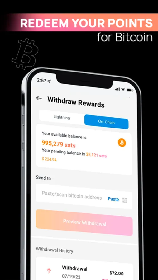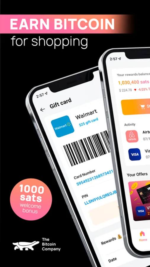 Make money while shopping online or in store. With The Bitcoin Company app, we offer up to 25% instant cash back in bitcoin on everything you purchase: gas rewards, gaming rewards, gift card rewards, and Visa card rewards. We let you transfer, send a payment, or withdrawal Bitcoin rewards to your own wallet anytime, via on chain Bitcoin or on the Lightning Network.