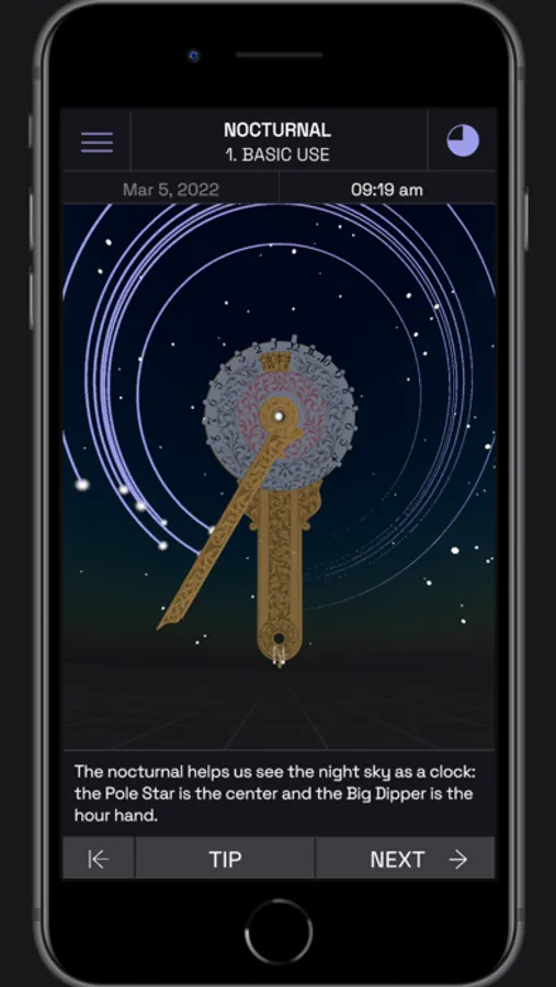 You'll learn how to use these historical instruments (a nocturnal, a sundial, a celestial globe, and an astrolabe) and be able to apply them in the real sky — right now, wherever you are. You can make use of 20 guided units or set out on your own in the new Exploration Mode. While you're exploring, you'll also come to see how the movements of the heavens arise: of the Sun, the Moon, and the stars.