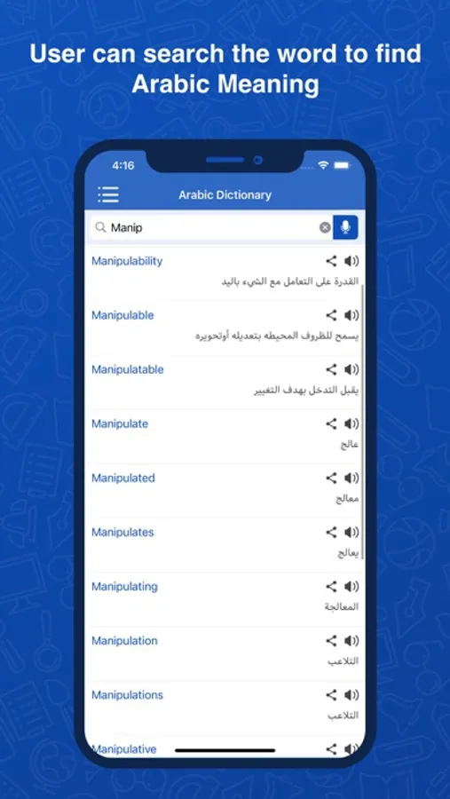 4- In our Arabic dictionary and translator app, users can search over 50000+ words to convert English to Arabic and Arabic to English.