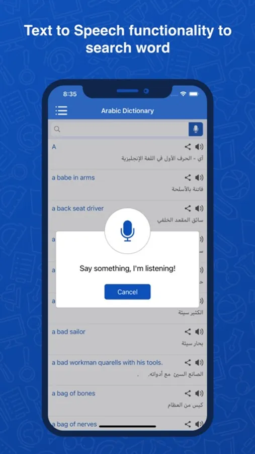 2- In Arabic Dictionary: Translator app, Users can search the word by their voice and read word meaning in both Arabic and English.