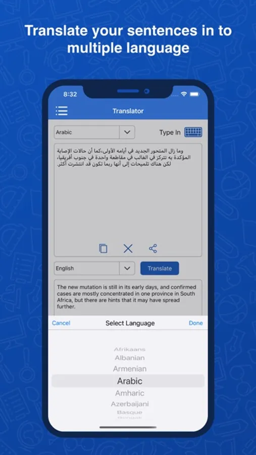 6- There is a feature in our app that you will not find in any other app is- Users can write the sentences in the selected language and translate them into the other selected language also they can copy and share the translated text with anyone.