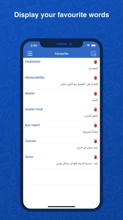 7- You can create a favourite list in our app of the translated words and can share it with anyone in their English and Arabic meaning.