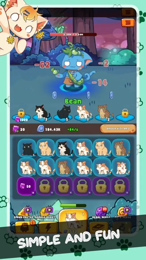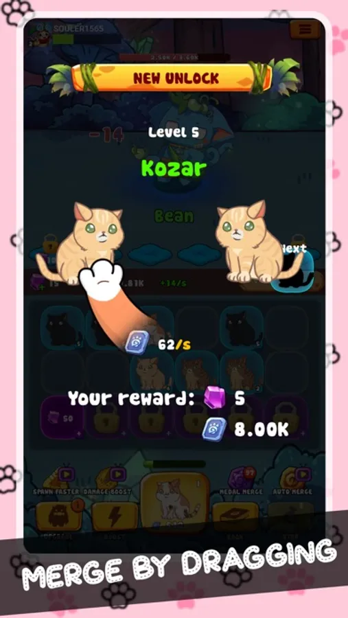 Merge Merge Cat is a game where you can merge cute kitties together, decorate them with accessories, feed them and show off by participating in cat contests.