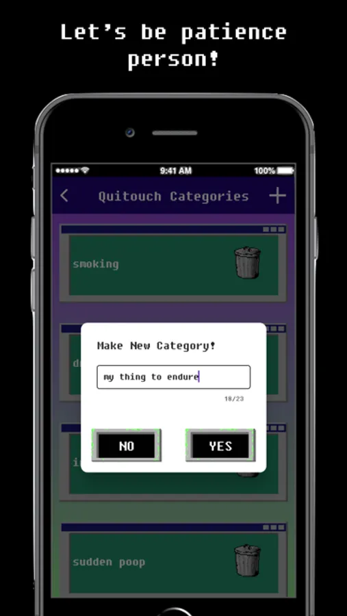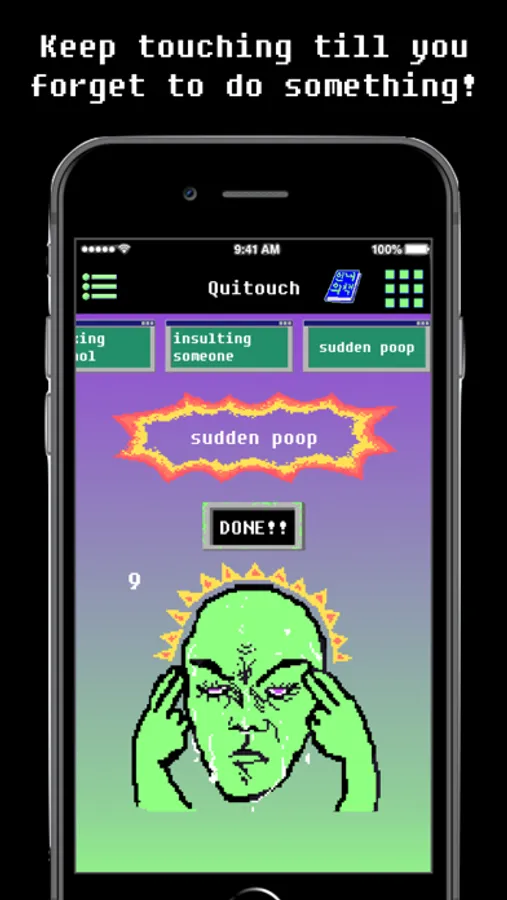 By keeping touching this app's character: quitachi, you could endure your bad desires. With the same way, you can endure whatever needed patience like sudden poop!