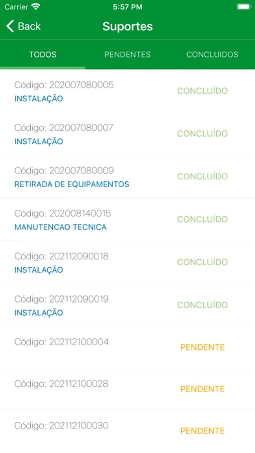 Suporte: Acesso à lista de suportes abertos e concluídos