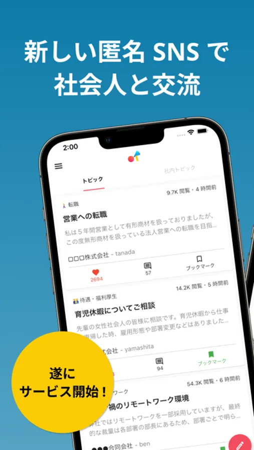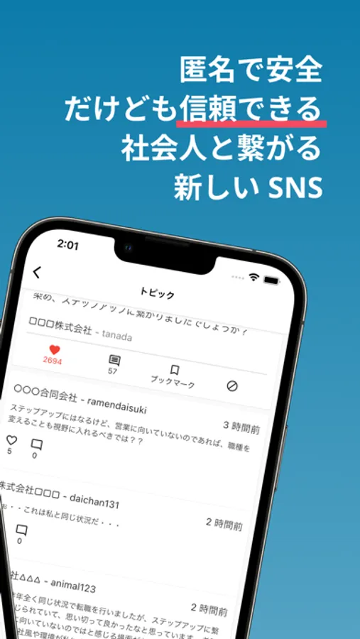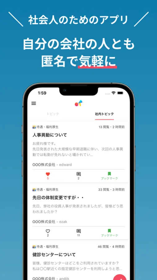 Workom (ワーコム) は、社会人と交流できる新しい匿名 SNS アプリです。交流相手の所属会社が確認できるので、いつでも確かな情報を安全に手に入れられます。