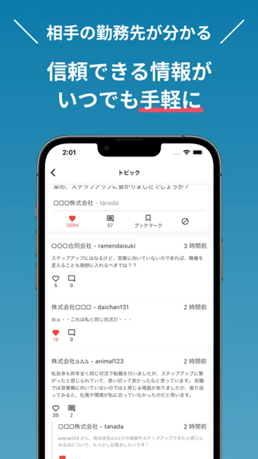 Workom では、投稿を行なっているユーザーの所属会社を本人確認しております。社用メールアドレスを本人確認のために一度だけ使用しますが、他のユーザーが本名やメールアドレスを知ることはありません。