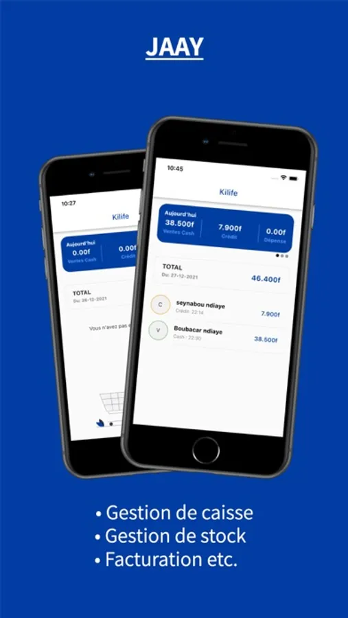 Que vous dirigiez une grande boutique formelle ou quelques échoppes en bord de route. jaay est conçu pour vous aider à gérer votre boutique. C’est une application complète de caisse enregistreuse, de gestion des stocks et de gestion des clients. Elle permet aussi entre autres la création de factures Avec une interface simple et facile à apprendre, et des fonctionnalités puissantes sous le capot qui rendent la gestion de votre entreprise plus facile et plus efficace.