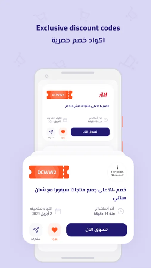 أحصل على آخر الخصومات والعروض من جميع الماركات العالمية والمتاجر حول العالم, يمكنك عن طريق تطبيق كوبونلي كذلك الحصول على كوبونات الخصم الرائعة لاستخدامها في أشهر المتاجر العالمية, لا تفوت الفرصة وقم بتحميل التطبيق واستفد من العروض والخصومات الرائعة