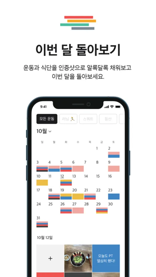 운동 &식단 인증샷으로 알록달록 채워보고, 이번 달을 돌아보세요.