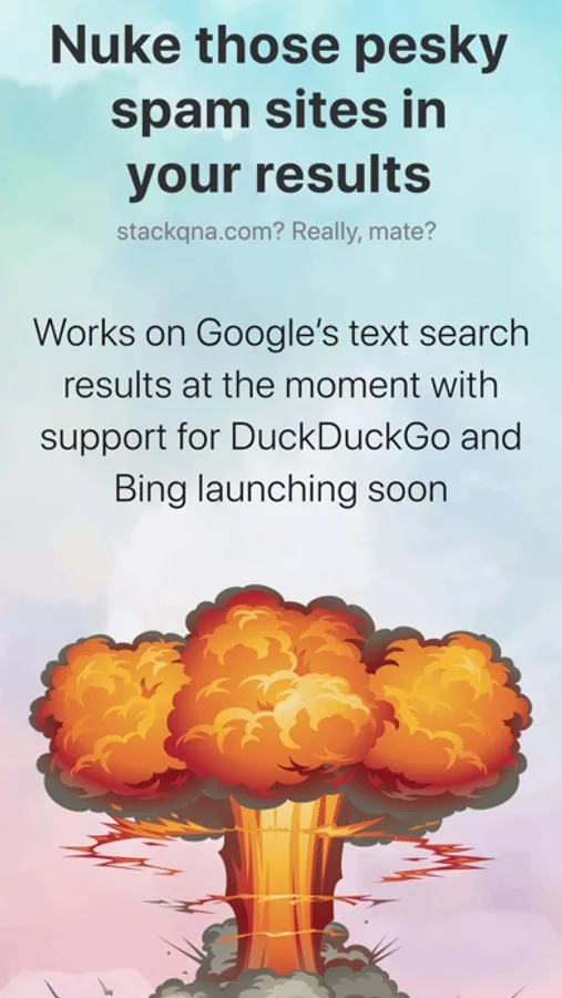Search Ban is a super minimal Safari extension that declutters and cleans up your search results. Tired of seeing tons of nonsense spam websites on your Google searches? Search Ban silently, and safely, removes all of them.