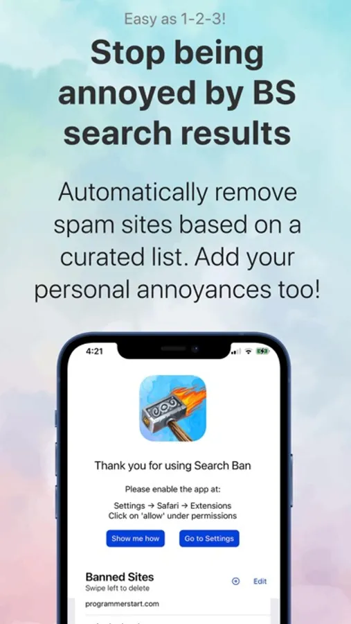 Ban sites with just a tap of the hammer icon. Monitor what sites are being banned on any page and unban with another tap. Easy peasy!