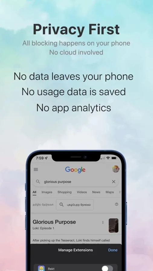 - All the blocking happens on your device with literally ZERO data being recorded or sent back to be data mined.