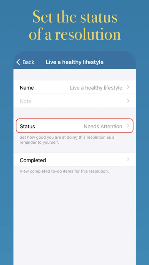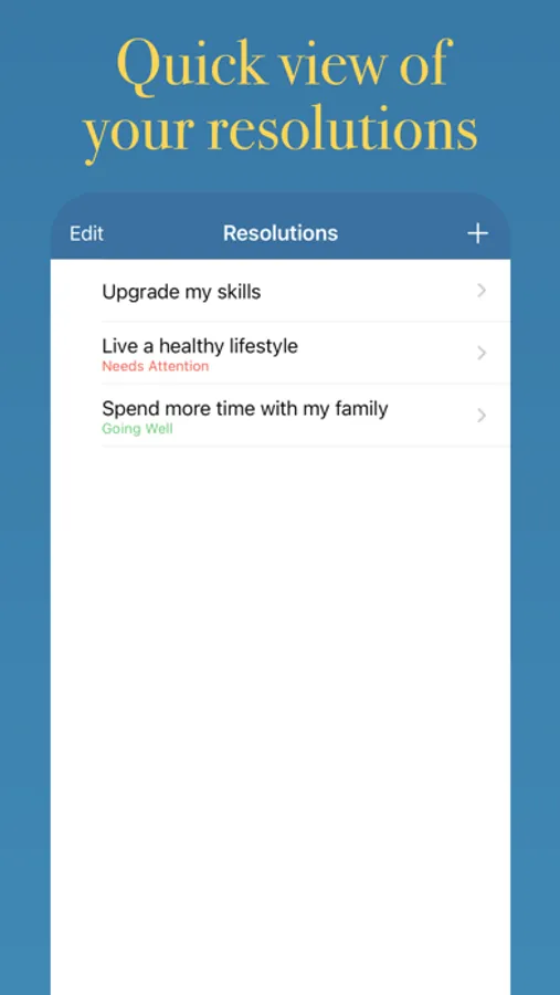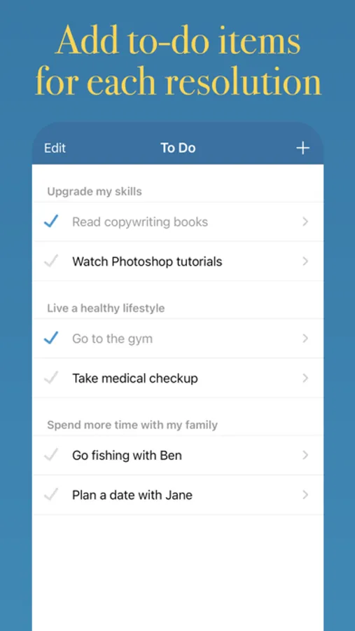 For each resolution, you can add to-do items. It helps you take real actions to keep your resolutions.