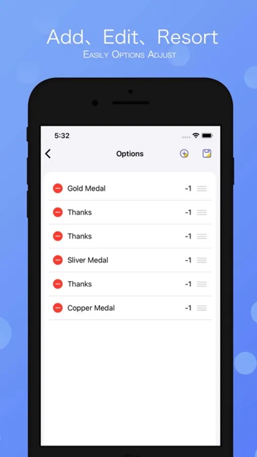 4. Entertainment function: option entries can be edited, added, sorted at will, adjust the weight of probability of appearance, can be used as daily life to add fun, KTV entertainment, drinking order, punching, truth or dare, company morning meeting, team building, activity selection, etc.;