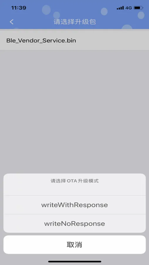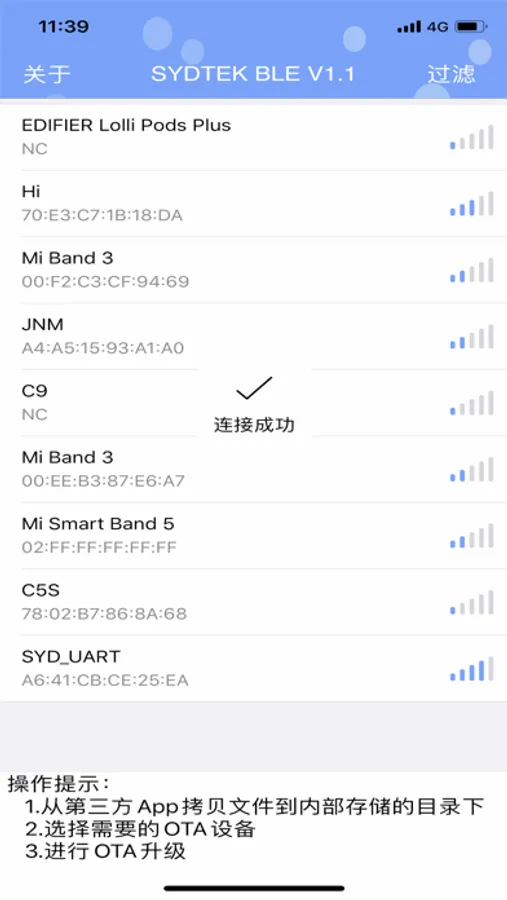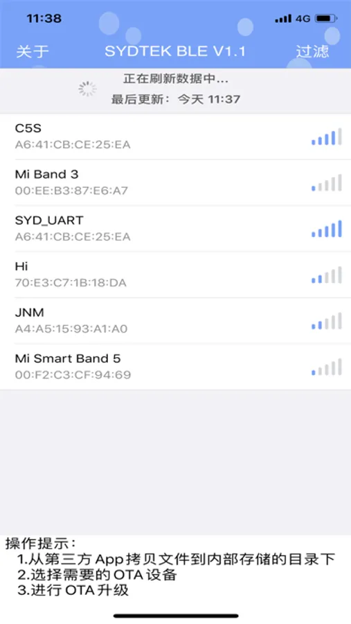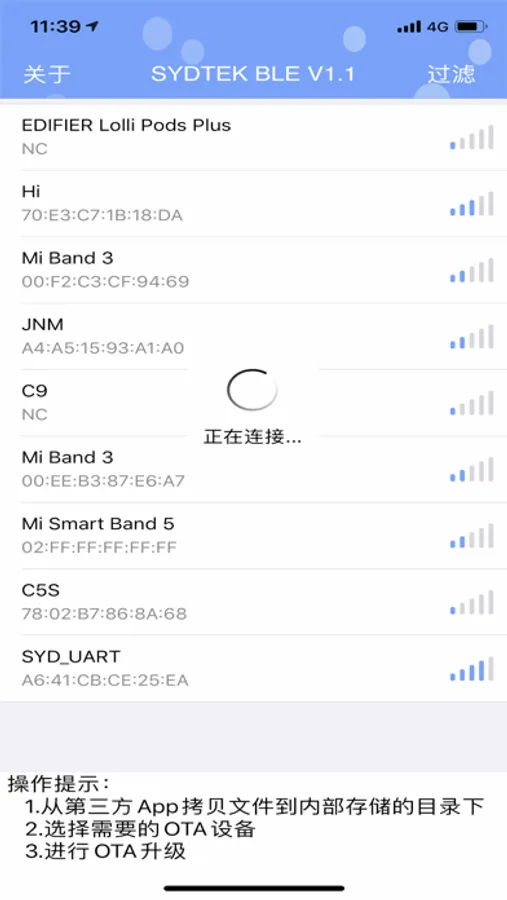 "SYDTEK BLE"这个app只是适配version 3.0协议,在升级的时候需要先把升级的bin文件发送到微信或者Q Q,然后分享到本app(因为ios系统管理不支持选择文件)
