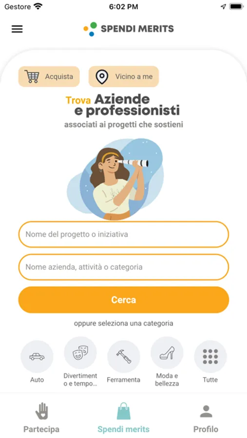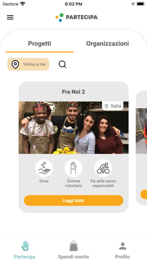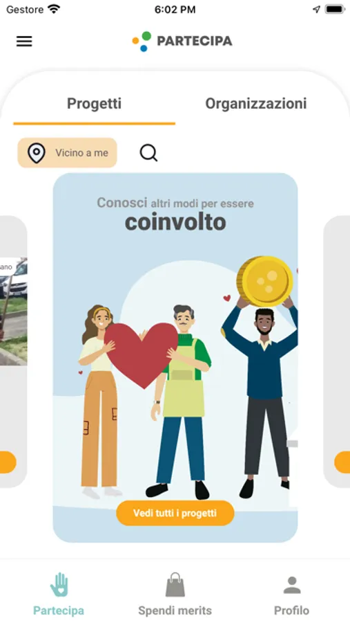 Trova nella app progetti ad impatto sociale ed ambientale del tuo comune, di enti non profit, di gruppi di cittadini e partecipa come volontario o come donatore, ricevi dei merits come segno di gratitudine e sostieni l’economia virtuosa acquistando con i tuoi merits beni e servizi presso gli operatori economici di prossimità e presso e-commerce virtuosi.