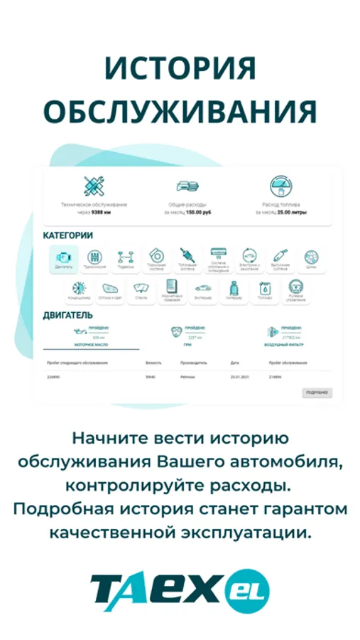 Забудьте о головной боли с автомобилем! TAEXEL – это не просто сервисная книжка, это ваш личный помощник на дороге, который держит под контролем расходы авто, подсказывает лучшие автосервисы и экономит ваши деньги!