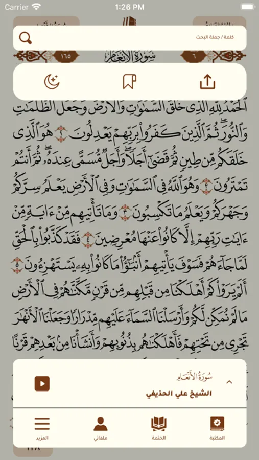 • إمكانية الوصول إلى تفسير الشيخ ابن عثيمين بالضغط على الآية أثناء القراءة.