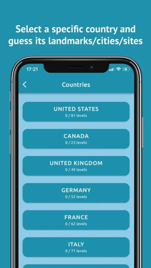 - you can also choose a specific country (currently 10 countries are available) to guess its most famous landmarks, cities, natural sites and UNESCO World Heritage sites.