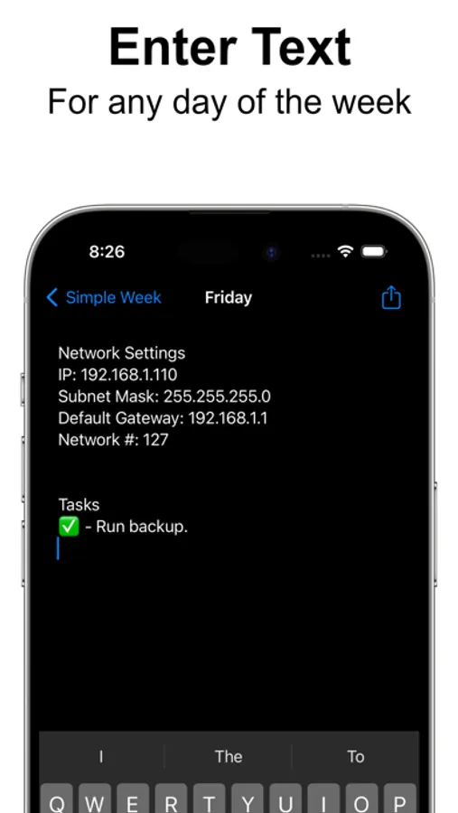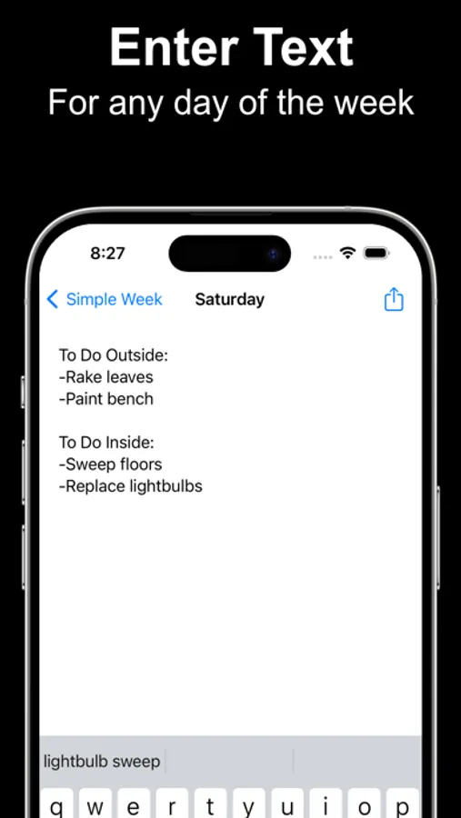 Simple Week is a wonderful app to keep weekly notes or to-do tasks or even a weekly planner. There are no logins, or complex configuration to worry about. Just open the app, select a day of the week and type whatever you need. Use the Export button to export your texts to a chosen file.