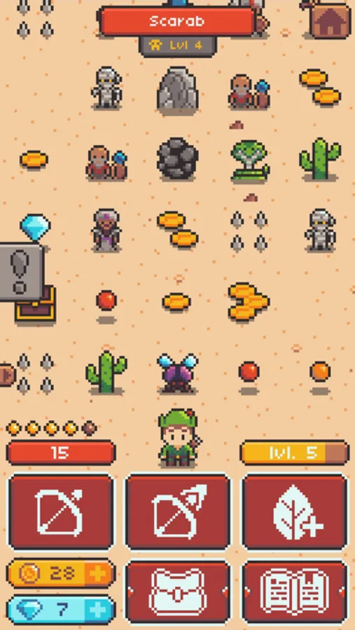 The realm of Eternis is a grid based world with procedurally generated tiles. This feature guarantees highly replayability and endless fun. On each play through you can decide which path do you take, the risky one or the safe one? With high risk comes high reward. Every step counts!
