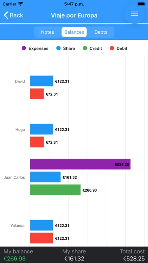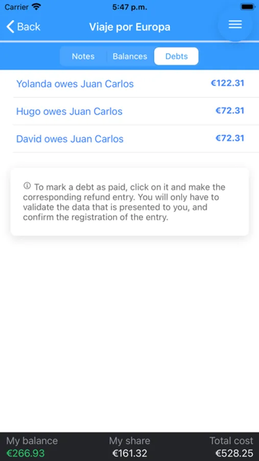 We can also see how much we owe each person, based on the current status of the group. If the group is square, the application will notify us of this situation.