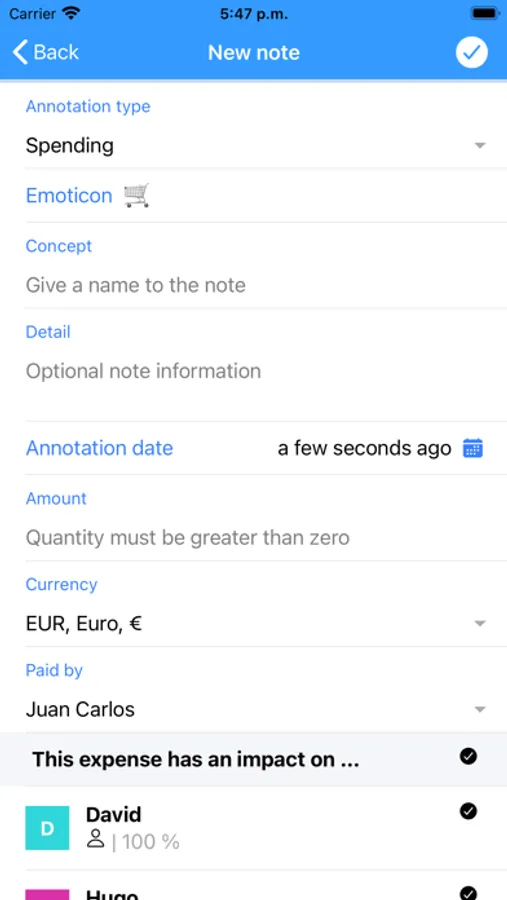 Not all people have the same weight in different expenses. For example, in trips, we could decide that the children are only going to be passed on 50% of the expenses; however, to adults, 100%. We can assign a percentage to each participant and, by default, in the notes in which they take part, this percentage will initially be assigned to them (although this can also be changed later).