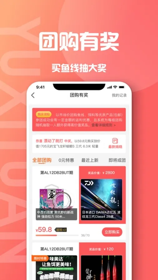 参与品牌渔具多人团购,团购有返利,还有机会得正品大牌渔具!