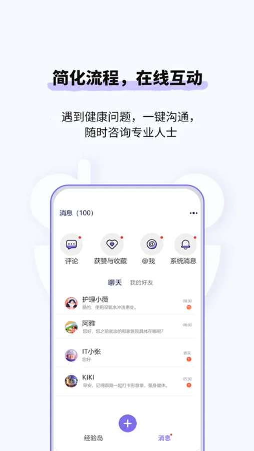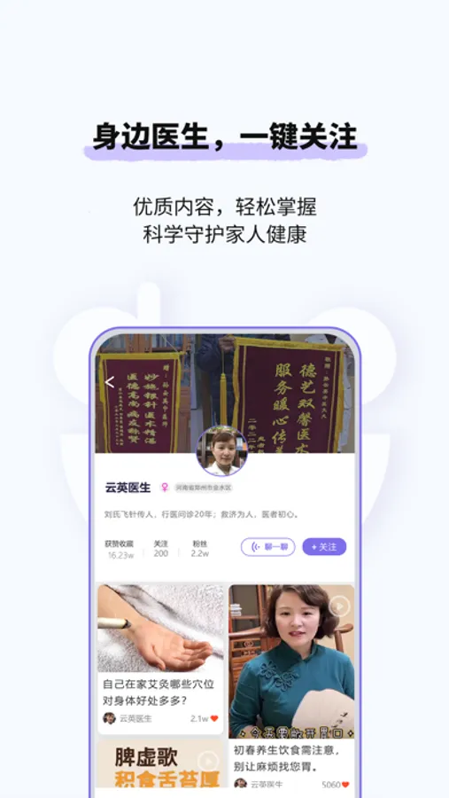 【在线互动】遇到健康问题,一键沟通!关注医生和专业人士,发送私信,平台每个医生和专业人士,都经过严格的资质审核。