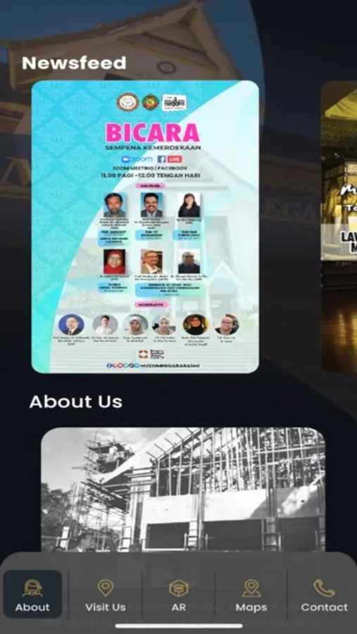 Download the app and experience Augmented Reality (AR) at Muzium Negara (The National Museum of Malaysia) via your mobile phone! This app is a platform for everyone to feel the virtual experience of Muzium Negara and get info such as:
